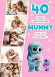 This is a greeting card with a pink background featuring five rectangular photo upload areas on the left side and two cartoon monsters, one blue and one purple, holding flowers on the right.