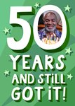 Featuring fun in-your-face typography with stars on a green background. There is one photo upload area in the zero of the number '50'.