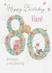 "Happy birthday Hazel 80 wishing you a very special day". 'Hazel' can be personalised!