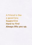 Front of card: Featuring gold typography on a white textured background. Text reads: "A friend is like a good bra: Supportive, hard to find, always lifts you up."