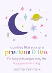 Front of card: Illustration of a crescent moon, stars and planets with text below Text reads: "Aunties like you are precious & few I'm lucky to have you in my life happy mother's day autine connie x".
