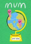 A heartfelt Mother's Day card featuring an illustration of a globe with two location markers connected by a dotted travel line, symbolising love across distances. Set against a vibrant green background, this card is perfect for expressing love to a mum who is far away.