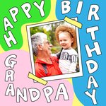 Front of card: Illustrated colourful background with hand lettered typography and photo frame taped in the centre" Text reads: "Happy Birthday Grandpa" With editable photo.
