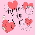 Typographic illustration of lovehearts, Champagne glasses and cake, on a pink background