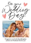 Front of Card: Black calligraphy on white background with photo frame and text below Text reads: "On your wedding day. Congrats to our lovely Granddaughter and her new Husband. Good on ya!" With customisable text and photo.