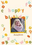 This card features fun, bright fridge magnet alphabet letters spelling out “Happy Birthday” around a central photo frame, with handwriting style text below.