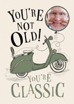 A funny and vintage style, photo upload birthday card featuring a sketchy, hand-drawn illustration of a classic Vespa style scooter with a balloon tied to the back of it. There is 1 photo upload area inside the balloon.