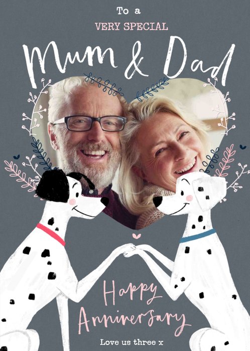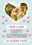 Angela Chick, bright colourful design featuring a loveheart shaped photo upload area and ten small red hearts, with two white panels on a pale blue background. The first editable part of the caption reads Mum & Dad, followed by non editable Happy Anniversary. The last part of the caption is editable and reads 70 Superb Years.