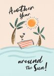 Featuring a modern illustration of a sunny beach scene complete with palm trees, cocktail, beach towel, sun and sea.