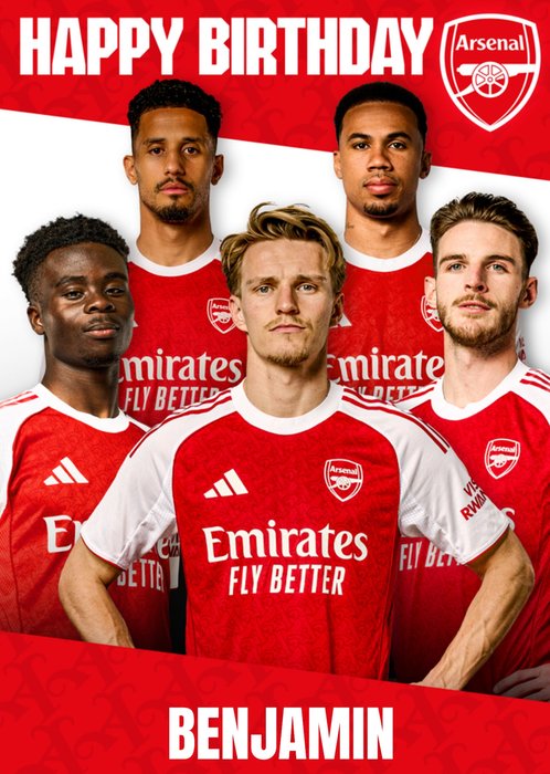 This greeting card features five Arsenal football players in red and white kits standing together, with bold text at the top and the Arsenal logo on a red patterned background.