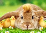 Featuring a super cute photograph of a rabbit lying down with baby chicks sheltering underneath its big floppy ears. There is also one chick standing on top of the rabbit's head.