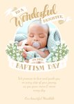In the center of the card there is a photo upload circle. Above text reads: 'To a wonderful Daughter' and below, 'On her Baptism Day'. Text is written over banners framing the photo upload circle. White flowers are bursting out of either side of the bottom banner. Below there is text, 'We promise to love and guide you on every step of your journey, as you grow more & more every day Our beautiful Meadhbh', this can personalised!