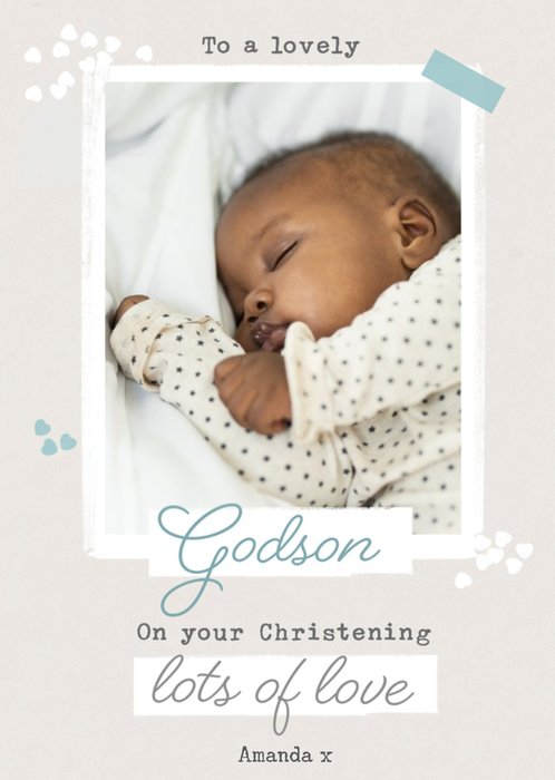 In the center of the card there is a photo upload circle. Above text reads: 'To a wonderful Godson' and below, 'On his Christening'. Text is written over banners framing the photo upload circle. White flowers are bursting out of either side of the bottom banner. Below there is text that reads, 'Lord, protect this precious child Throughout each night & day, Bless her as a Child of God, And guide her in Your way Love, Nana', this can be personalised!