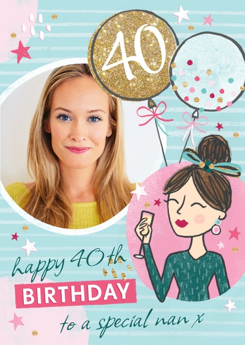 Front of card: Featuring Barbie in a vintage dress surrounded by jewels and a heart shaped photo frame. Text reads: "40 today born to sparkle". '40' can be personalised!