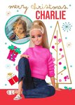 Front of card: Featuring Barbie with festive illustrations and a circular photo frame. Text reads: "Merry Christmas Charlie". 'Charlie' can be personalised!