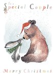 Featuring a cute illustration of a bear and hare touching noses, wearing a santa hat and scarf with snow falling behind them.