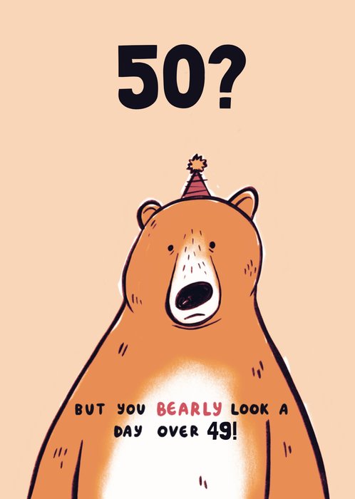 Front of card: This card features a cute bear wearing a birthday hat with the playful message, “50? But you bearly look a day over 49!” creating a humorous pun for a milestone birthday.