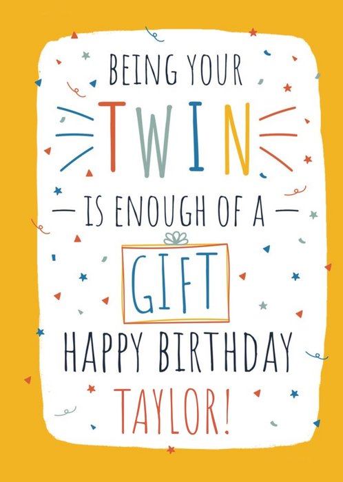 "Being Your Twin Is Enough Of A Gift Happy Birthday Taylor!" Name can be customised.