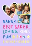 "Nanny: best baker, loving, kind, fun, & a birthday queen!".