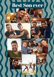 Front of card: The greeting card features a collage-style design with multiple photo frames set against a wavy blue-green background. The bold text “Best Son Ever” is displayed at the top in white, creating a celebratory and personalised feel. There are ten photo upload areas in different sized rectangular frames.