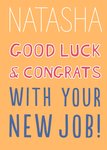 Big Bold Type Typographic caption that reads Good Luck and Congrats With Your New Job! There is an option to personalise the name of the person you are sending the card to. The card background colour is orange.