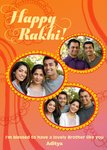 Front of card: The card features a bright and colourful patterned background with 3 photo upload frames on top. Text on card reads: "Happy Rakhi! I'm blessed to have a lovely brother like you Aditya."