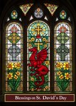 Featuring a tall stained glass church window with a red dragon, yellow daffodils and green crosses on a dark interior setting, this greeting card marks St. David’s Day.