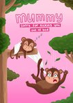 Illustration of Mummy and baby Monkeys on a tree branch with text above on a pink background.