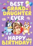 A bright and cheerful birthday card featuring characters from the popular show Bluey with a circular photo upload area between the characters, surrounded with colourful balloons, confetti, a paper chain decoration, a present and a birthday cake. Bold yellow and white typography sits at the top and bottom of the card.