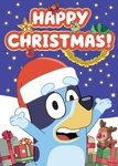 A bright and cheerful Christmas card featuring Bluey wearing a santa hat surrounded by presents. The card has text decorated with tinsel and baubles.