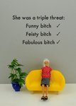 Front of card: Funny photograph a female doll sitting on a sofa, text above. Text reads: "She was a triple threat: Funny Bitch, Feisty Bitch, Fabulous Bitch". Back of card: Bold and Bright logo. Moonpig logo