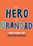 Front of card: My Grandad Father's Day Card Bold typography on an orange background. Text reads: "My hero my Grandad happy Father's Day from your grandkids". 'Happy Father's Day from your grandkids' can be personalised!