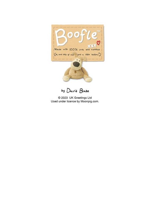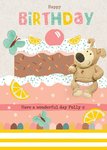Front of card: Boofle Birthday Card Featuring Boofle on a large cake. Text reads: "Happy birthday have a wonderful day Polly x". 'have a wonderful day Polly x' can be personalised!