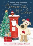 This Boofle greeting card design features the adorable knitted dog character, Boofle, holding a festive gift and surrounded by hearts, stars, and glitter accents, with a warm and heartfelt message, creating a cosy and charming atmosphere perfect for a special occasion.