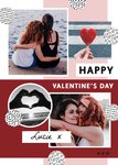 Front of card: Illustration of patterned circles on pink, red and white background with multiple photo upload frames in center. Text reads: "Happy Vlanetines Day""Lucie x" With editable recipient.