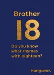 Featuring a simple design of bold text in a gold foil effect displayed on a dark blue background, this eye-catching design is perfect for celebrating a Brother's 18th birthday who has a good sense of humour.