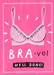 A humorous design featuring a hand drawn bra with white doodle lines and a white border on a pink background.