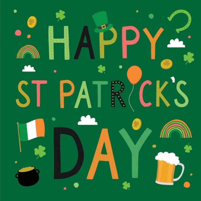 Typographic Saint Patrick's Day card with big colourful text, the text is surrounded by Irish flags, rainbows, balloons, pints of beer, pots of gold and leprechaun hats.