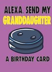 Front of card: Granddaughter Birthday Card Bright bold typography with an illustration of Alexa. Text reads: "Alexa, send my Granddaughter a birthday card".