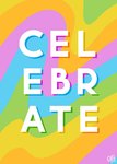 Bright colourful wavy line design with the word celebrate sitting in the centre of the card The rear of the card has white background with the Corey Paige Designs and Moonpig logos