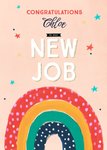 Front of card: Bright fun illustrations of stars and a rainbow on a peach background. Text at the top of the card .br> The text reads: "Congratulations Chloe On Your New Job"