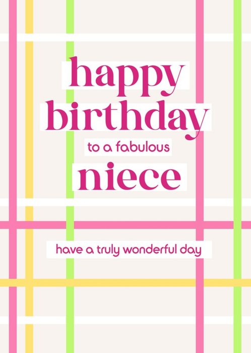 Bright graphic design featuring green, pink and yellow lines on a cream background The non editable caption reads Happy Birthday to a fabulous Niece have a truly wonderful day
