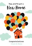 Bright fun and contemporary illustration of a happy house with balloons floating through the sky on a white background. The caption reads non editable Yay, you've got a new home, editable recipient's names.