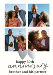 A modern greeting card featuring four square photo frames arranged in a neat grid, with two silver hearts and flowing anniversary lettering underneath. The design sits on a crisp white background.
