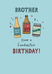 Featuring hand-drawn typography and illustrations of a bottle of pale ale, a bottle of beer and a can of lager in the centre with stars and confetti surrounding them on a light blue background. It’s a birthday card celebrating a brother who enjoys beer.