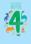 Front of card: Brother's 4th Birthday Dinosaur Illustrations Card A large number 4 has small dinosaur illustrations surrounding it. Text reads 'Happy Birthday' followed by 'Brother' both of the text boxes can be personalised!