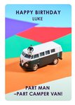 Text reads: "Happy Birthday Luke Part Man - Part Camper Van!". Name can be customised.