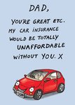 Front of card: Happy Father's Day Card Cartoon Illustration of a red car with hand written type on a blue background. Text reads: "Dad, you're great etc. My car insurance would be totally unaffordable without you. X".