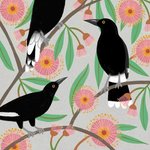 Three Illustrated magpies on a colourful grey pink gum leaves background.