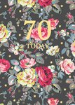 This greeting card design features a dark grey background adorned with bold and elegant floral illustrations in shades of red, pink, yellow, and white, accompanied by green foliage and small yellow accents, with the text “70 Today” prominently displayed in the centre in light yellow.